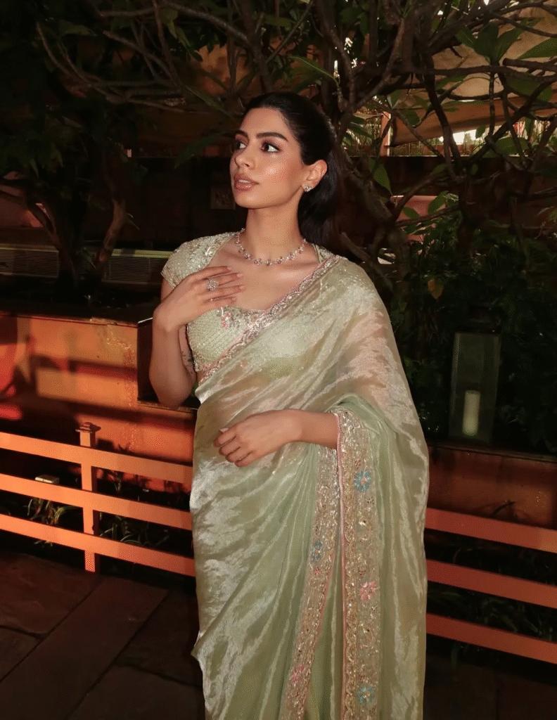When it comes to timeless Indian elegance with a touch of modern allure, Khushi Kapoor’s latest look in a Manish Malhotra creation is a true showstopper. The young starlet, known for her effortless style and poise, recently turned heads in a sage-green tissue sari that beautifully captured the designer’s signature craftsmanship — a seamless mix of tradition, luxury, and soft femininity.